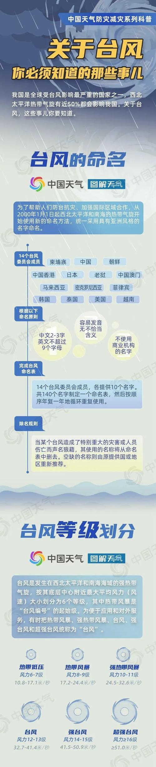 台风的名字运用的是热带气旋命名法,也就是国际上统一的命名方式。根据热带气旋影响周边国家地区,然后制定一个命名表,按照顺序年复一年地循环使用,现在命名表上一共有140多个名字,分别由亚太地区的柬埔寨,中国大陆,朝鲜,日本,老挝等等14个成员国和地区提供。