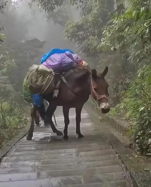 另一种方式是骑骡子下山,他们选择可靠的骡子作为交通工具,骡子能够熟练地穿梭于山间的小路,使下山更为快捷和方便。